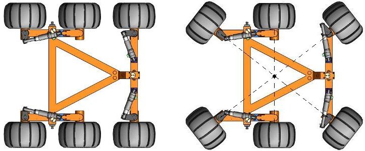 In order make the rover more agile over difficult terrain, a set of actuators can change the orientation of the front and rear wheels, rotating them about a vertical axis (a swivel inside the bogie) so that all wheel axes intercept the same point at the center of the rover.