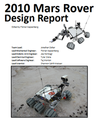 With the 2010 fist place victory, the year has come to a close. A formal design report has been completed discussing every aspect of the design as well as lessons learned along the way. Our team has made this report public in an effort to speed up the development of University Mars Rover designs. We believe that other teams should be able to learn from our mistakes so that they can avoid making similar mistakes in the future. We have also made public a 3D PDF of our CAD model. This is a full 3D rendering that can be opened using Adobe Reader. Click on the thumbnails on the right to download the Design Report or CAD Model.